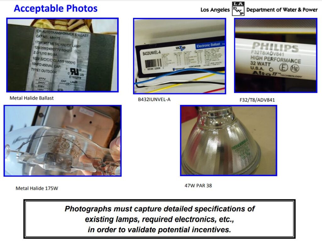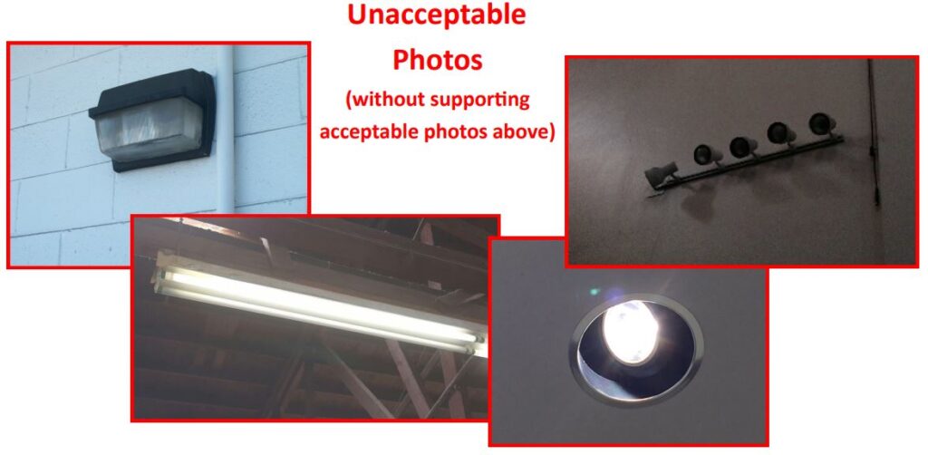 - Take photographs representative of the existing fixture types, lamps, ballasts, etc. Submit a minimum of one luminaire photo taken at the installation address for each unique measure proposed. Example of acceptable photograph.